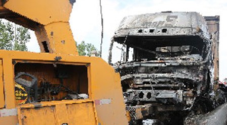 根据现场情况,消防官兵立即铺设多条干线对起火点进行包围灭火并冷却油罐。为防止油料泄漏造成二次起火,消防官兵对事故现场喷洒泡沫进行大范围覆盖。灭火过程中,消防官兵发现小轿车驾驶位置有一具已经高度炭化的遇难者遗体。16时27分大火被全部扑灭。随后,消防官兵调集清障车对集装箱货车进行牵引并将小轿车从两车中间拉出后,配合交警部门将车门进行破拆进一步对车内进行检查、清理,并将遇难者遗体取出。