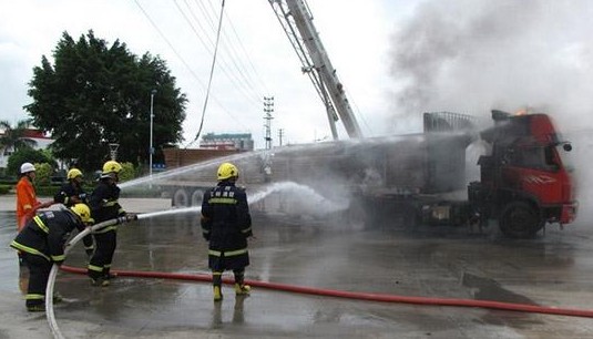 现场,吊车的吊臂伸出的钢缆触碰到高压线,长吊钩连接着大货车上的金属货物,大货车金属车身触电后起火,冒出滚滚浓烟,大火吞噬着车头,并向油箱蔓延,两辆车上的人员及时逃生。玉林市消防支队特勤中队的官兵在确定高压线已断电后,立即打开水枪齐射,很快把火扑灭。